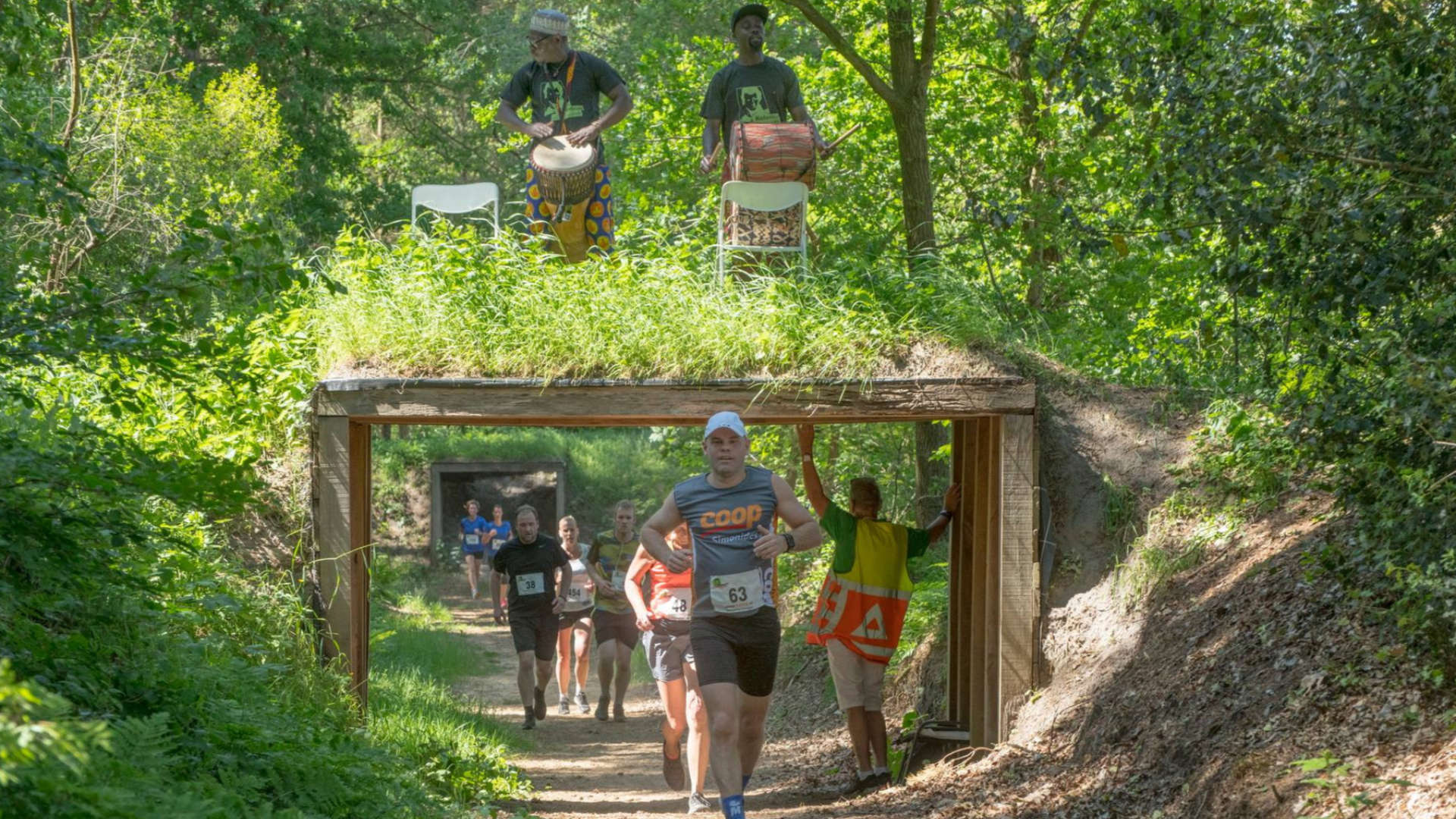 Relaxed staan we de Tweede Pinksterdag aan de start. Gels hebben we niet mee, want het is ‘maar’ een halve marathon. Die heb ik nog trouwens nooit nodig gehad op deze afstand. Het is behoorlijk warm, maar dat is niet erg want deze wedstrijd gaan we toch niet tot het gaatje. We gaan vandaag van het mooie parcours genieten. Echt inlopen doen we dan ook niet, een paar losmaakoefeningen volstaan. We starten extra rustig om de spieren op te warmen en laten de mooie route op ons inwerken. Het zuidelijkste deel bevat een extra lus ten opzichte van de vijftien kilometer van vorig jaar. Het is ook het mooiste stuk van het toch al fraaie parcours. Veel single tracks, behoorlijk ruw terrein, en juist daardoor erg genieten.