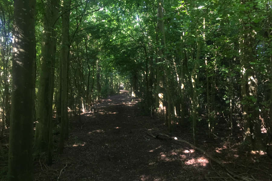 De aanlooproute naar de experimentele 400 meterbaan: het lekker zachte houtsnipperspad door de 'bossen' van Park Hesselingen. Mooi sfeertje en lekker koel.