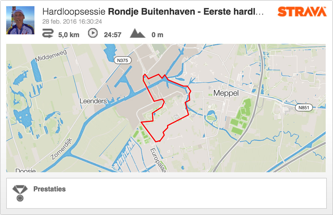 Halverwege het fietspad beginnen de benen moe te worden. Ik probeer het tempo te handhaven. Als ik thuis de hardloopsessie upload naar Strava blijk ik hierin te zijn geslaagd. Een gemiddelde snelheid van net onder de 5 minuten per kilometer voor dit externe hardloopdebuut is bijzonder. Trots plaats ik de prestatie op Facebook. Het ontlokt een veel ervarener hardloper dan ik de opmerking dat dit wel erg goed is voor een eerste vijf kilometer. Ik lees zijn reactie op Facebook best wel trots een paar keer opnieuw. Buiten hardlopen smaakt naar meer!