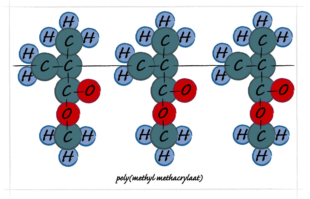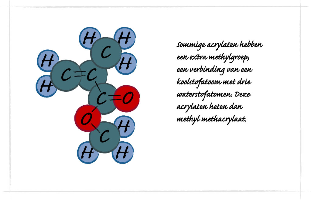 Een ester is een molecuul van koolstof, waterstof en zuurstof dat ontstaat wanneer een zuur reageert met een alcohol. Een vinyl is een molecuul dat bestaat uit twee koolstofatomen met een dubbele binding. De chemische benaming hiervoor is methacrylaat. Sommige acrylaten hebben een extra methylgroep, een verbinding van een koolstofatoom met drie waterstofatomen. Deze acrylaten heten dan methyl methacrylaat.