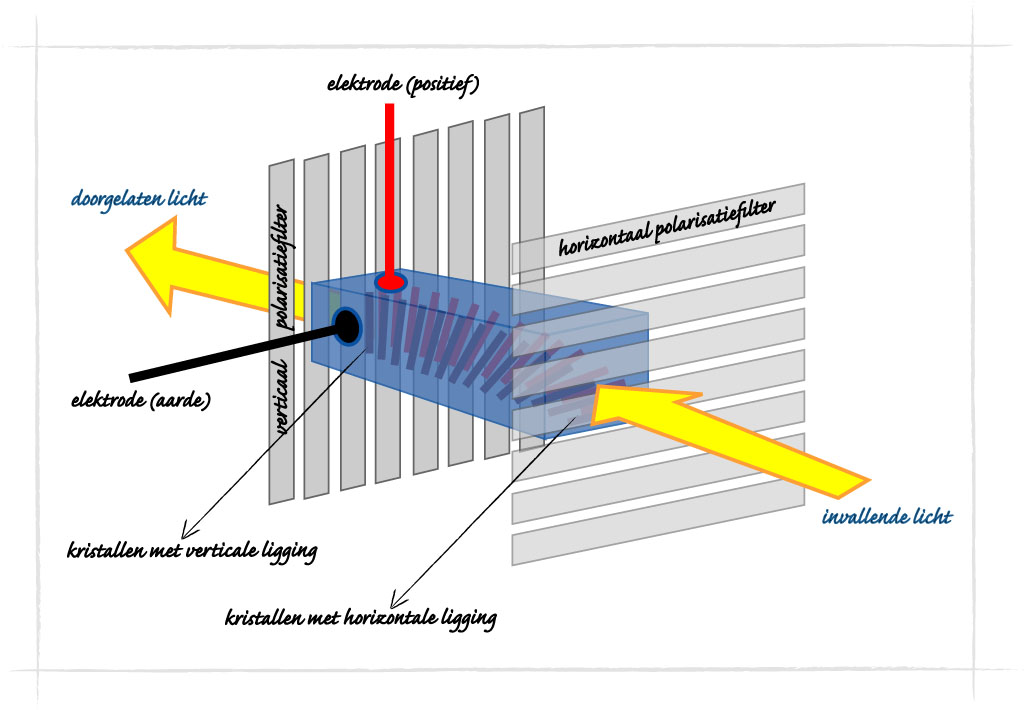 De tweede glasplaat krijgt dezelfde behandeling als de voorste, maar nu lopen polarisatiefilter en groefjes verticaal. De laag vloeibare kristallen die in aanraking komt met de achterste glasplaat komt daardoor verticaal te liggen. De eerste laag kristallen ligt dus horizontaal en de laatste verticaal. Alle lagen daartussenin draaien langzaam maar zeker naar elkaar toe, waardoor een getordeerd geheel ontstaat. Het elektrische geleidende substraat wordt ten slotte aangesloten op twee elektroden. Licht dat op de voorste glasplaat valt, wordt in horizontale richting gepolariseerd. De lichtgolven komen evenwijdig aan de eerste laag met vloeibare kristallen het substraat binnen. De moleculen in iedere laag geleiden het licht door het substraat, waarbij de verstrengeling van de moleculen ervoor zorgt dat het licht steeds dezelfde oriëntatie aanneemt van de laag die de golf passeert. De lichtgolven worden daardoor langzaam maar zeker omgebogen van horizontale naar verticale richting. Ze bereiken dus evenwijdig aan het tweede polarisatiefilter de achterkant van het substraat en kunnen daardoor het filter passeren. Dat levert dus een lichtpunt op. Wanneer spanning op het substraat wordt gezet, ontwarren de moleculen van de kristallen zich en gaan parallel aan elkaar liggen. Het licht wordt daardoor niet meer parallel aan iedere laag door het substraat geleid, maar van richting veranderd (‘gebroken’). De lichtgolf bereikt daardoor niet meer evenwijdig aan het tweede polarisatiefilter de achterkant van het substraat en kan het filter niet passeren. Dat levert dus een donkere punt op.