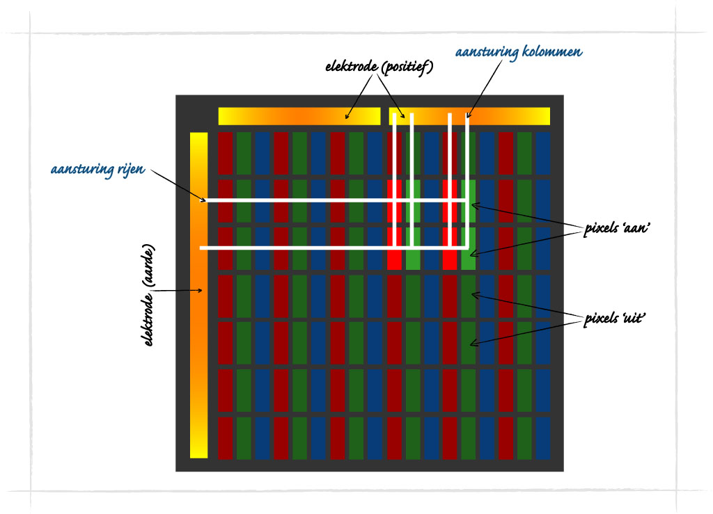Bovenstaande LCD’s zijn veel te primitief voor het beeldschermen van uw computer. Deze moeten om te beginnen een eigen lichtbron hebben en kleurenweergave is tegenwoordig een vereiste. Deze voorwaarden zijn niet zo’n probleem: ieder LCD-scherm in een computer is voorzien van een kleine tl-buis, die meestal achter het scherm is geplaatst. Kleuren komen tot stand door iedere pixel te voorzien van drie subpixels met een rood, groen en blauw kleurenfilter. De aansturing van een kleurenscherm met een resolutie van 1024 x 768 pixels x 3 subpixels betekent 2.359.296 pixels die moeten worden ‘aan’ of ‘uit’ gezet. De oplossing hiervoor is een matrix in de indiumtinoxide elektrode met de juiste hoeveelheid kolommen (1024 x 3 = 3072) en rijen (768). Moet een bepaalde pixel ‘aan’ dan zorgt een doorzichtige printplaat met elektronica achterop de elektrode ervoor dat de juiste rij en kolom onder stroom worden gezet. Op het kruispunt hiervan komt de pixel onder spanning te staan en gaat ‘aan’. Dit type aansturing wordt een ‘passieve’ matrix genoemd. Een nadeel van de ‘passieve’ matrix is dat de pixels ietwat traag reageren op de stroomstootjes, waardoor bijvoorbeeld de cursor een serie ‘spookcursors’ achter zich aan krijgt wanneer u snel over het beeldscherm beweegt. De controle over de juiste hoeveelheid spanning is bovendien niet optimaal, waardoor nabijgelegen pixels ook ‘aan’ kunnen gaan en ook het creëren van grijswaarden lastig wordt. Dit gaat ten koste van het contrast.