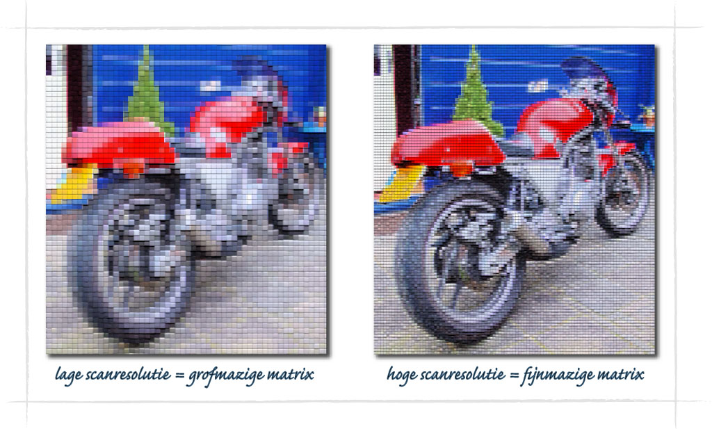 Het digitaliseren van een afbeelding in een scanner is onder te verdelen in twee stappen waarin de grootte van de resolutie en de kleurdiepte worden vastgelegd. Een scanner verdeelt de originele afbeelding in een matrix van cellen. Hoe meer cellen er in de rijen en kolommen van deze matrix passen, des te hoger de resolutie waarmee de scanner zijn werk kan doen. De resolutie wordt bepaald door de hoeveelheid cellen die in één inch zijn gepropt. Bij een extreem lage resolutie is de dichtheid van de matrix zo gering dat de individuele cellen bij wijze van spreken met het blote oog zijn waar te nemen. Moderne scanners werken echter met zodanig hoge resoluties dat de matrix van cellen niet meer zichtbaar is voor het menselijk oog.
