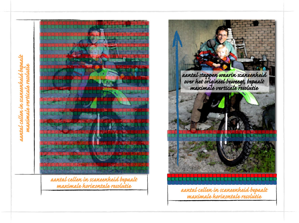 Scanners maken gebruik van zogenaamde CCD-eenheden om het origineel af te tasten. Er zijn scanners die gebruikmaken van een CCD die op zichzelf al een matrix is, net zoals digitale camera's foto's schieten. De resolutie ligt dan vast en wordt bepaald door het aantal rijen en kolommen per centimeter. Veel scanners maken echter gebruik van een rij van fotocellen die langzaam onder het origineel door loopt. De verticale resolutie ligt in dit geval vast en wordt bepaald door het aantal cellen in de kolom, terwijl de horizontale resolutie wordt bepaald door het aantal keer dat de fotocellen per centimeter het beeld vastleggen. De scanner moet de fotocellen daarvoor zeer nauwkeurig onder het origineel kunnen doorvoeren: een bescheiden horizontale resolutie van 600 dpi betekent namelijk dat er 600/2,54 = 236 keer per centimeter wordt gescand. De scanner moet dus in staat zijn om stapjes van 1/236 = 0,04 millimeter te maken en te onthouden welke beeldinformatie op ieder van deze minuscule delen was te vinden.