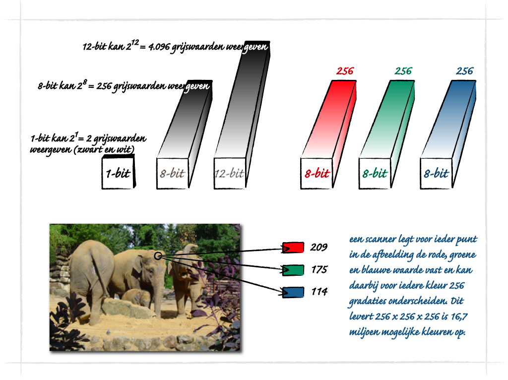 De meting van de kleuren levert een analoog signaal op, dat dus moet worden omgezet in digitale waarden. De mate waarin een scanner in staat is om kleurnuances om te zetten in digitale equivalenten wordt de kleurdiepte genoemd, die wordt uitgedrukt in bits. Een bit kan aan staan (= 1) of uit (= 0), het principe van digitale informatie. Een onderscheidend vermogen van 1 bit betekent dus dat een kleur er op een bepaalde plek aanwezig is of niet. Dit is dus een zeer geringe kleurdiepte. Een kleurdiepte van 8 bit betekent dat acht bits in alle mogelijke combinaties aan of uit kunnen staan, wat twee tot de macht acht = 256 verschillende grijswaarden oplevert. Een scanner meet op iedere plek uit de matrix op welke waarde rood, groen en blauw het origineel heeft. Een scanner die in staat is om per kleur 256 tinten vast te leggen, kan daarmee 256 x 256 x 256 = 16,7 miljoen verschillende kleuren onderscheiden. Dit noemt men een 24-bit kleurdiepte of 'ware kleuren'.