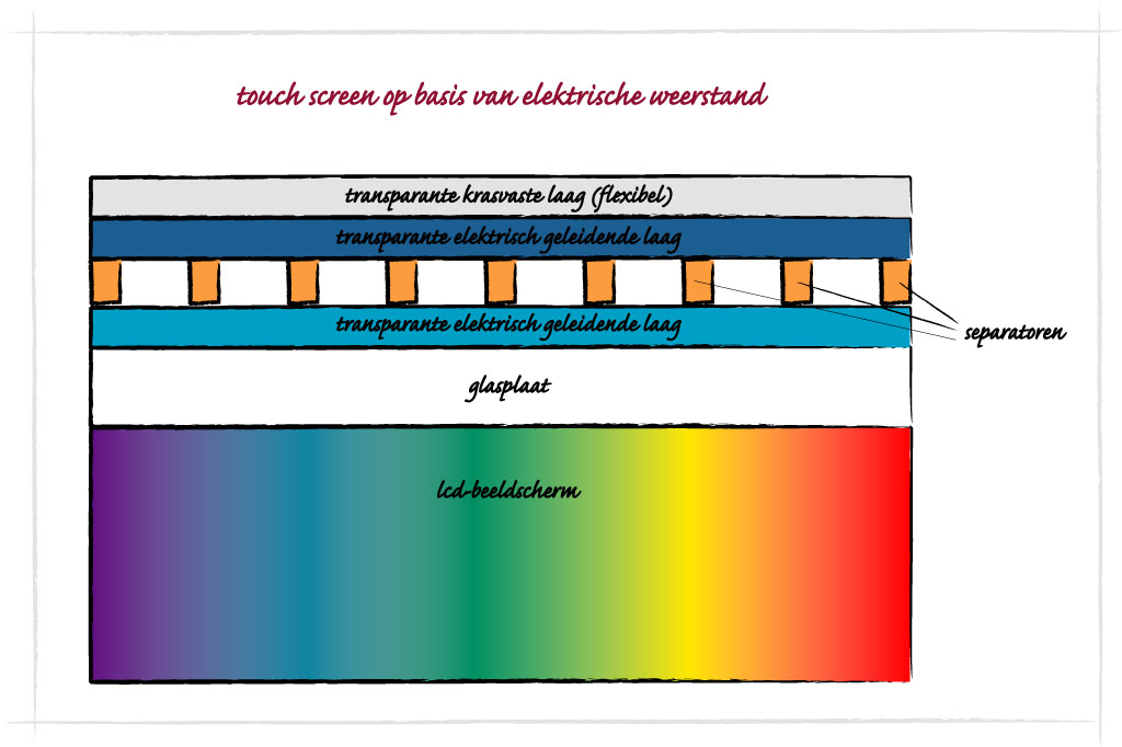 Het eerste type touchscreen dat vaak in gadgets wordt toegepast, is een methode die is gebaseerd op elektrische weerstand. Bovenop de glasplaat van een normaal beeldscherm worden twee lagen met elektrisch geleidend materiaal gelegd, met daar tussenin een laag met elementen die beide lagen uit elkaar houden. Helemaal bovenaan wordt een krasbestendige laag aangebracht. Als het beeldscherm aan staat, loopt een elektrische stroom door beide lagen heen. Als iemand het beeldscherm ergens aanraakt, maken de twee lagen op die plek opeens contact. Dit zorgt ervoor dat het elektrische veld op die plek verandert en dat wordt opgepikt door het besturingssysteem van het beeldscherm.