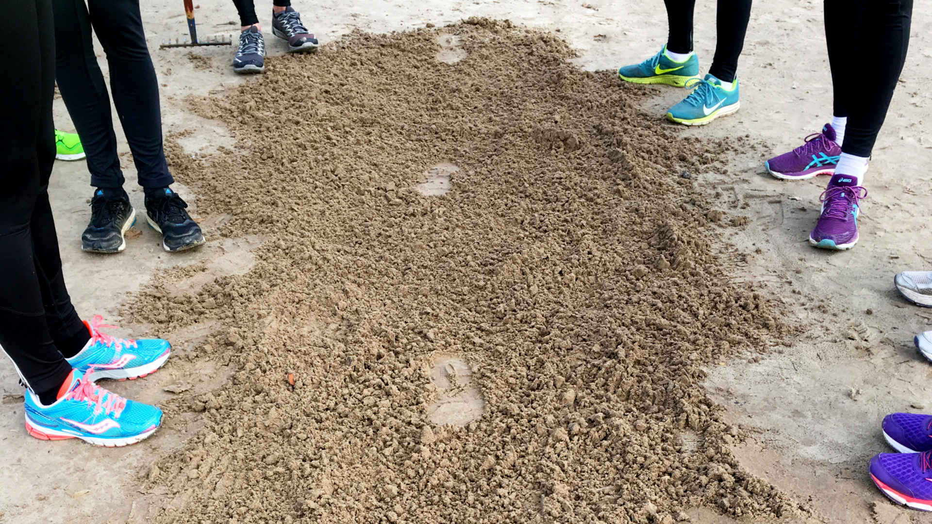 Geconcentreerd neem ik mijn positie in. Het lijf recht omhoog maar niet te gespannen, als het ware lichtjes omhooggetrokken door een touwtje aan mijn kruin. Het hoofd steekt niet naar voren en de ellebogen zijn in een hoek van negentig graden gebogen. De duimen rusten zachtjes op de handen. Ik hel in deze houding heel licht naar voren en kom daardoor vanzelf in beweging. De aandacht gaat nu naar de voeten. Het is de bedoeling dat ik niet afzet, maar de loopschoenen als het ware van de grond afpel en optil. Om ze even daarna mooi onder mijn zwaartepunt in een zo vlak mogelijk stand te laten neerkomen op de grond. Veel tijd om 'erin' te komen heb ik niet. In minder dan tien passen bereik ik een stuk strand dat afwijkingen van de gewenste manier van lopen genadeloos bloot zal leggen. Ik hardloop door een haag van acht paar ogen vier ChiRunning-passen over de aangeharkte zandstrook. Bij de laatste stap lijk de voet behoorlijk weg te zakken. "Shit', denk ik, maar als ik me omkeer ligt daar gelukkig een keurig vlak spoor.