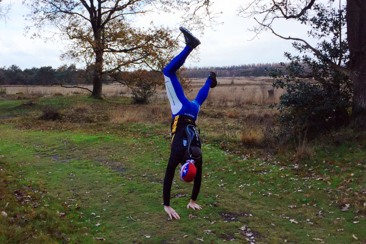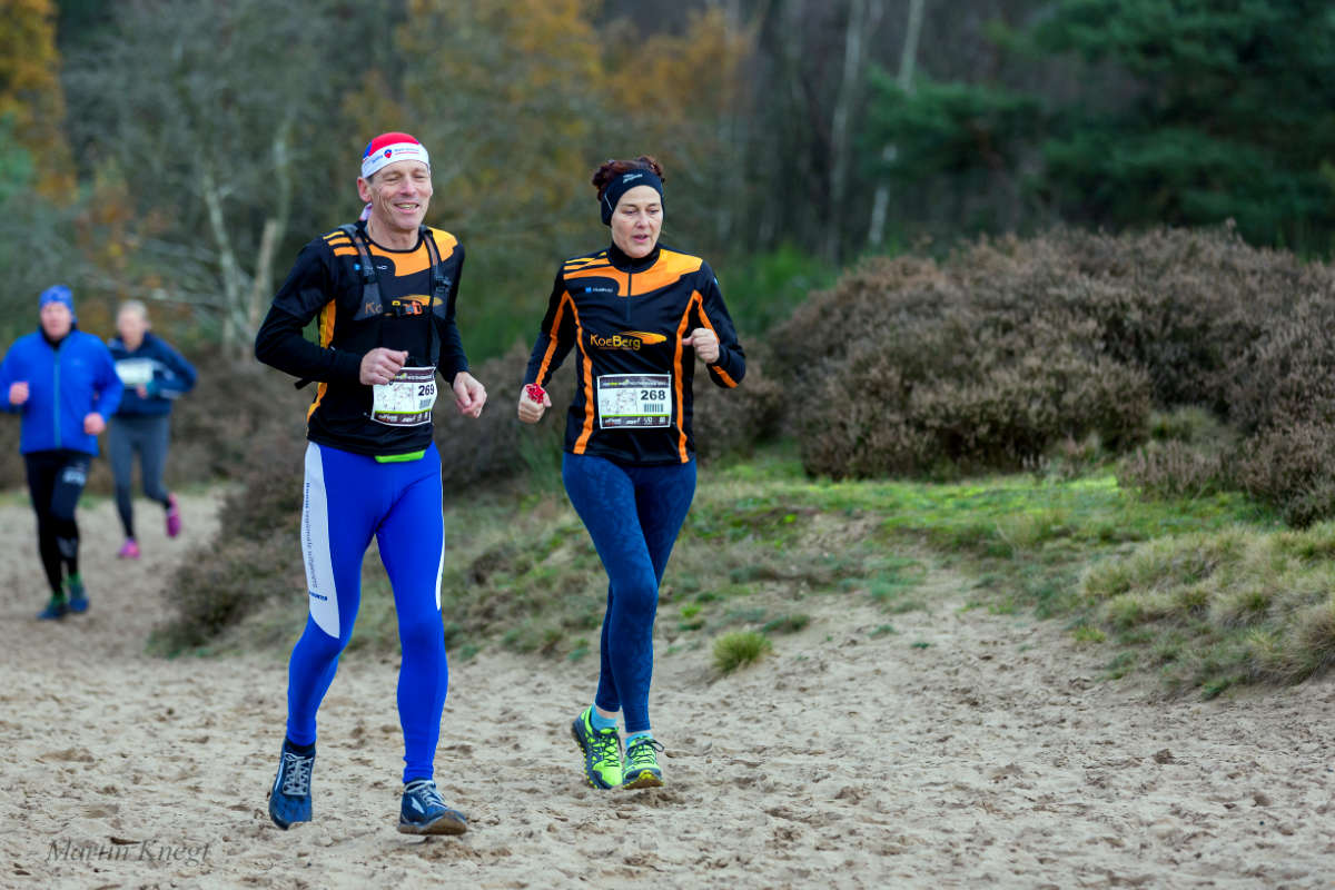 Het parcours is mooi afwisselend. We crossen niet allen door bossen, maar ook door flinke stukken mul zand, pakken heuveltjes mee en hobbelen over de heide en langs vennetjes. Bijna niets op aan te merken, alleen kennen we het overgrote deel van het parcours al van eigen hardloopsessies. Het venijn zit vandaag in de staart. We weten al wat ons te wachten staat: de beklimming van de stuwwal bij de hunebedden. Ik heb er zin in en probeer de snelheid er in te houden. Ook Lidia weet de hindernis hardlopend te slechten. Daarna is het nog een paar honderd meter uitlopen tot we de schaapskooi weer in hobbelen.