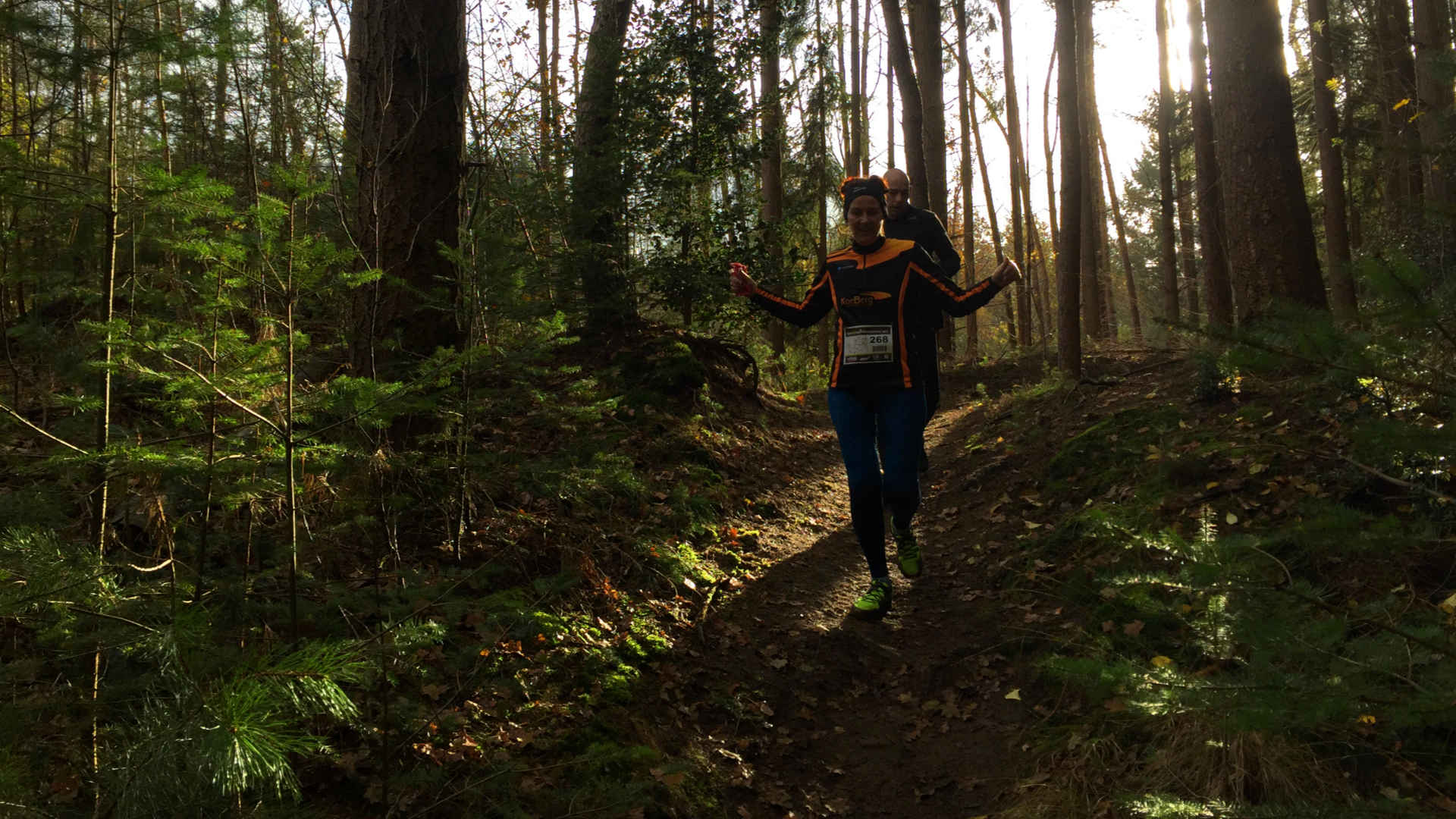 Met de kou blijkt het onderweg enorm mee te vallen. De zon breekt zelfs regelmatig door. Het tempo is relaxt en het parcours is goed te doen. Ja, er liggen behoorlijk wat plassen, maar die zijn meestal goed te ontwijken. Behalve een enorme plas die een paar kilometer verder dwars over de weg ligt. Niet toevallig staat daar een fotograaf zijn schijfje vol te klikken. Dat gaat vast heroïsche beelden opleveren. Het eerste deel door het bos hebben we nog niet eerder belopen. De bomen zijn hoog en staan dicht op elkaar. Als de zon zich er doorheen wurmt, kleurt het schemerige bos hier en daar goudgeel. Ik snel vooruit om Lidia te fotograferen en de sfeer te vangen. Als ik haar daarna weer probeer bij te halen en enkele hardlopers passeer, stamp ik met de linkervoet tot over de enkels in een modderpoel. Zo, de nieuwe trailschoenen zijn bij deze ingewijd.