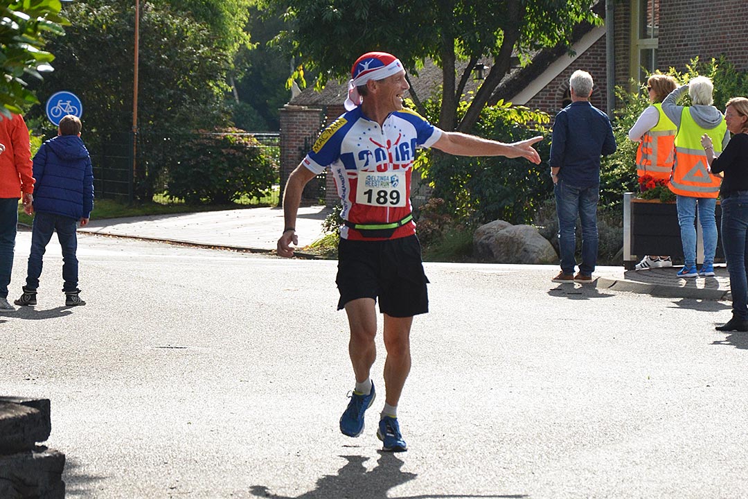 In het Staatsbos loopt het parcours gedeeltelijk over verharde zandpaden. Die afwisseling is best lekker. De man voor me komt steeds dichterbij. Ik zou hem kunnen 'pakken' maar dan moet ik hem wel over een smal paadje voorbij. Ik besluit te wachten tot we het asfalt van de J.J. Gorterlaan hebben bereikt. Via de Vijverweg en de Schotsweg gaat het richting 10-kilometer verzorgingspost, waar het 'bekerritueel' zich herhaalt. Het asfalt slingert en glooit heel lichtjes verder naar Het Vergulde Ros. Daar zouden mijn lief en de jongens wel eens kunnen staan. 'Hoe gaat het eigenlijk', vraag ik me op weg naar het gouden ijkpunt af. Het lijf voelt nog bijzonder fris en het tempo lijkt hetzelfde te blijven. Heel af en toe passeer ik een deelnemer, maar verder heb ik te weinig externe aanwijzingen voor mijn snelheid. Gewoon maar lekker doorlopen dus.