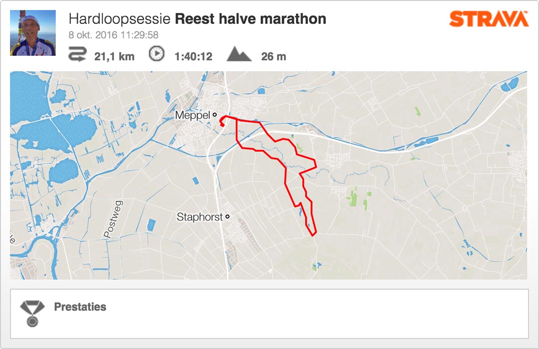 Over de bult heen is het nog drie kilometer, maar dat maakt allemaal niet meer uit. Ik ga mijn eerste officiële halve marathon gewoon uitlopen! Als ik terug in Meppel de atletiekbaan oploop en een eindsprint probeer in te zetten, blijk ik toch wel behoorlijk vermoeid te zijn. Met een grimas op het gezicht ren ik door de laatste bocht, maar met triomfantelijke armgebaren passeer ik de finish. Als ik hoor dat hoe snel ik de Elzinga Reest Run heb afgelegd, kan ik het nauwelijks geloven. Wow!