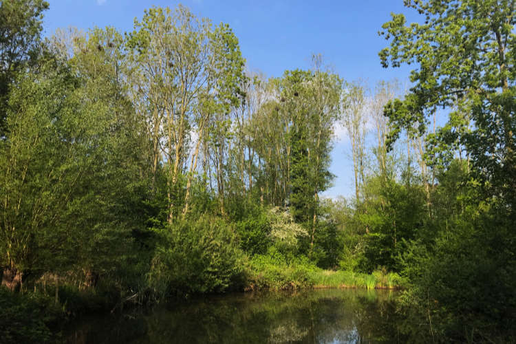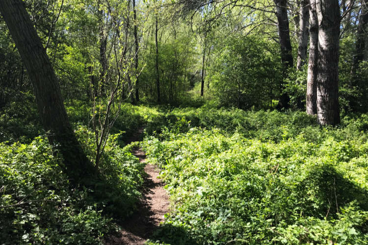 Na de lange klim over spoorlijn en snelweg voert een trap naar het groenste stuk Meppeler groen van de safari. Het bos is aan alle kanten ingeklemd door jachtige infrastructuur, en toch is hier het meest ‘oerwoudachtige’ deel van de route te vinden. Aan de noordkant slingert een steeds smaller wordend paadje naar een smoezelig poeltje. Een vogelliefhebber heeft er een waarnemingspost gebouwd van blauw landbouwplastic, compleet met geïmproviseerde afvalzak. De blik scheert langs het lentefrisse groen op zoek naar het vervolg van de route. Tevergeefs, dezelfde weg terug naar de trap dan maar.