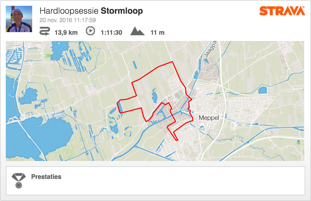 De gevreesde kilometers tegen de stormwind in over de Meppelerweg en Nijeveenseweg terug naar de bebouwde kom blijken mee te vallen. Wel begint de afstand merkbaar te worden in de benen. Ik combineer eerder gelopen ritten met de nieuwe kilometers en schat in dat het vandaag zo'n dertien kilometer gaan worden. Bijna goed, blijkt als ik moe maar nog steeds heel blij over deze hardloopsessie thuis kom. Wat een heerlijk loopje!