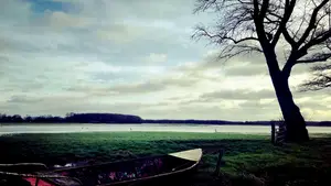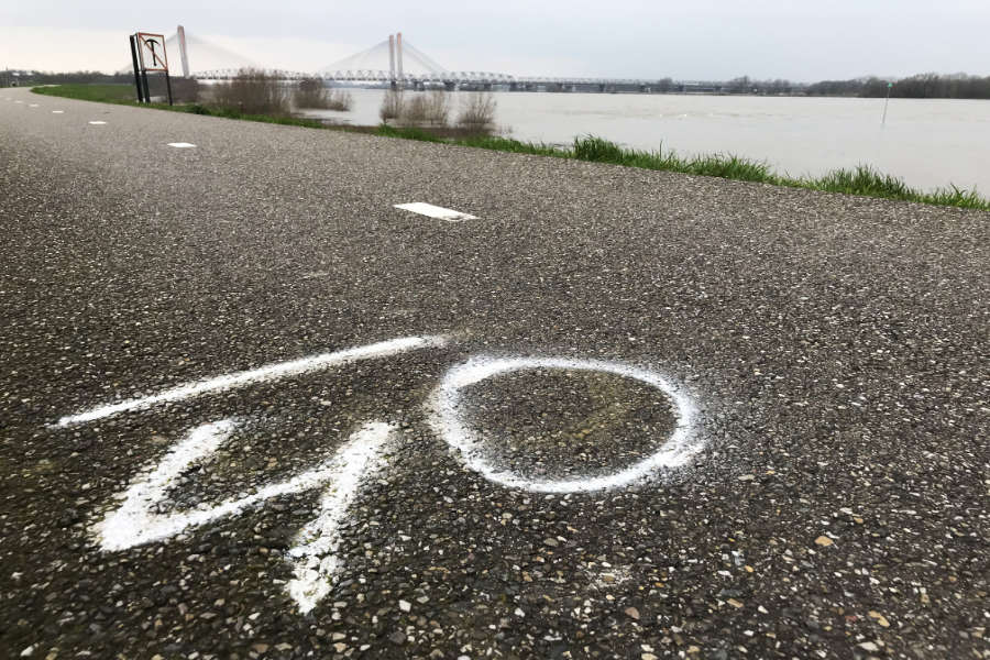 Vrijdag, de dag dat het dan toch echt gaat gebeuren. Op pad met een rugzakje gevuld met extra kleding, water, een sneetje ontbijtkoek, twee boterhammen, ov-chipkaart en giropasje, aangevuld met een flipbelt met vijf nakd-repen en een smartphone, blijkt het allemaal reuze mee te vallen. De wind heeft een rustdag genomen, de zon steekt voorzichtig haar kop tussen de wolken door en de rug houdt zich ook koest. De halve marathon blijkt een makkie, meld ik het thuisfront via WhatsApp. In optimale doen hol ik dan onbezorgd verder tot zo’n dertig kilometer, maar dat is mij vandaag niet gegeven. Al na ongeveer 24 kilometer beginnen de benen wat vermoeid aan te voelen en moet ik me bedwingen niet nu al te gaan aftellen. Wat me het beste lukt als het parcours me dicht langs de schitterende, ondergelopen uiterwaarden van de Maas leidt. Wat is onze rivierdelta toch mooi!