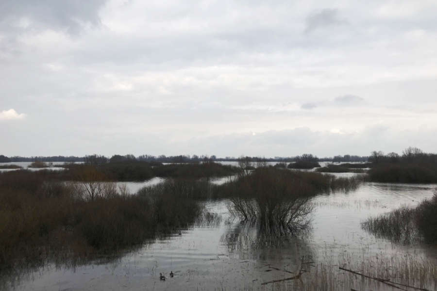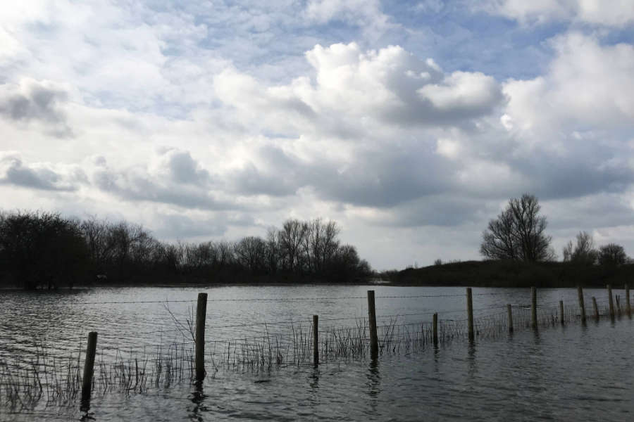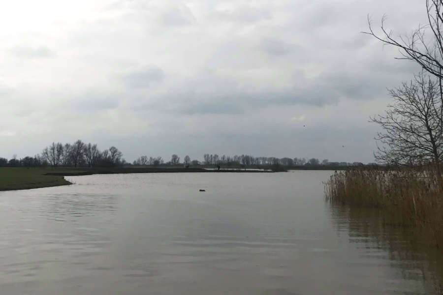 Bij Rossum meld ik het thuisfront dat er al 32 kilometer zijn afgelegd, dat alles nog prima gaat, ik ook nog veel mazzel heb met het weer en dat nu het aftellen echt mag beginnen. Nog geen kilometer na de laatste pauze trekt het dicht, koelt het af, dreigt het regelmatig en daalt er uiteindelijk ook nog een buitje op mij neer. Het doet me niet zo veel eigenlijk, want het rivierenlandschap toont zich hier op zijn ruigst. Man, wat is dat mooi. Rechts van me ligt een enorme plas water met eilandjes van donkerbruine struiken. In de verte ploegt een vrachtschip door de Waal, de rivier die dit onwerkelijke landschap heeft gevormd. Mijn ogen hebben geen flauw idee waar het ondergelopen deel overgaat in de rivier. Hopelijk heeft het navigatiesysteem van de schipper meer kennis van dit gebied.