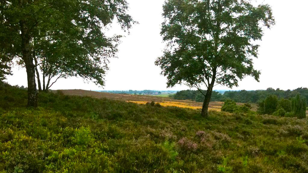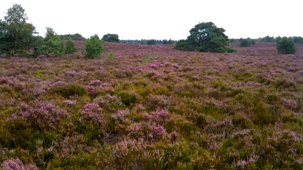 Op de Posbank blijken we bijna gelijktijdig te zijn aangekomen. Na een overheerlijke cola met appelgebak in het futuristisch vormgegeven paviljoen maken we met zijn allen nog een prachtige wandeling door de pieken en dalen van de Posbank. De hei staat er net als die rond de Holterberg bijna helemaal in bloei. Al wandelend besluiten we er snel terug te komen. De kinderen zijn het helemaal met ons eens.