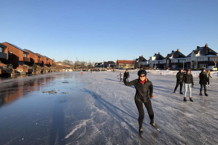 Hoe anders verloopt het vervolg van het weekend. ’s Middags besluiten we nog een uurtje in de Berggierslanden te gaan schaatsen. Dit wijkje roept door de kanalen, bruggen en plassen dezelfde sfeer op als schaatsen door Giethoorn, Dwarsgracht, De Wieden en de Weerribben. Iedereen op en rond het ijs geniet zichtbaar. Wij ook.