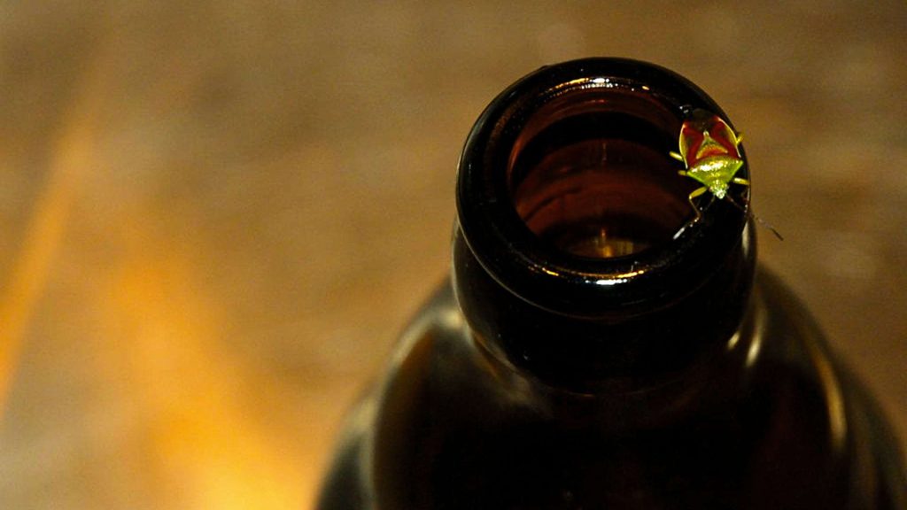 Wij zijn blijkbaar niet de enige bierliefhebbers in huis. Dit trof Lidia op een leeg flesje Kasteelbier aan. Behoorlijk zoet bier. Misschien is dat de aantrekkingskracht voor deze vreemde kostganger. Geen flauw idee wat dit voor een insect is. Nooit eerder opgedoken hier en daarna ook niet meer gezien. Het kleurrijke diertje is in ieder geval geen plaag dus.