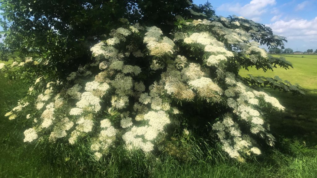 De vlierbes staat in bloei en dat is goed nieuws voor mensen die weten dat je heel lekkere dingen kunt maken van vlierbesbloesem. Mijn lief weet er in ieder geval wel raad mee.