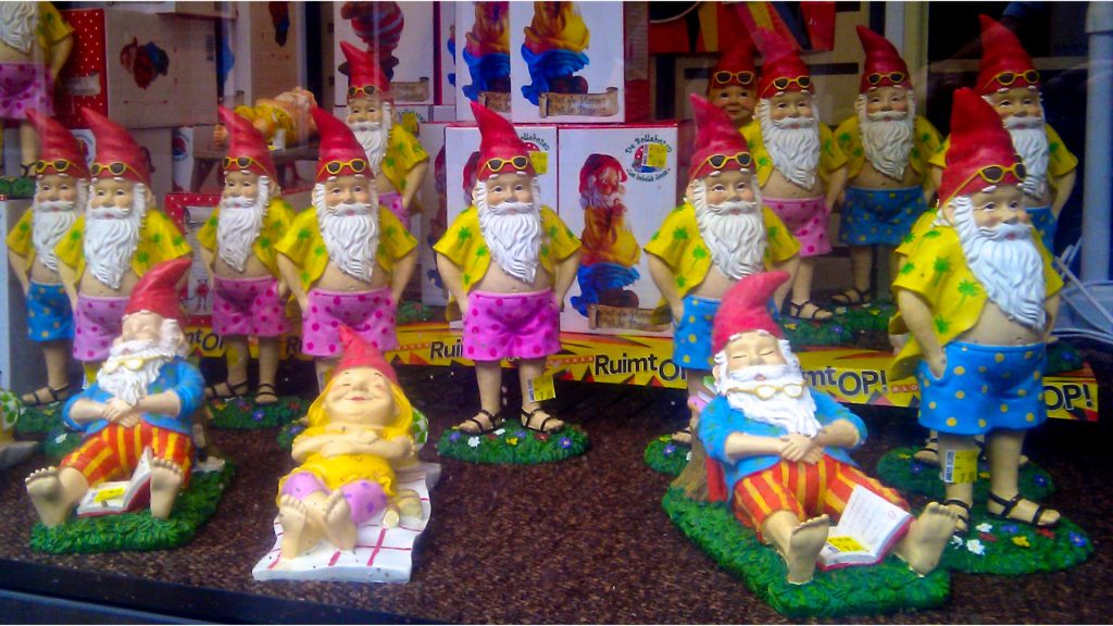 Op weg van een etentje op het terras van de Italiaan naar het ijsje van dezelfde oorsprong, kwamen we dit tafereel tegen. Het beeld van de dag, oordeelden Lidia en ik gelijktijdig over deze kabouterinvasie.