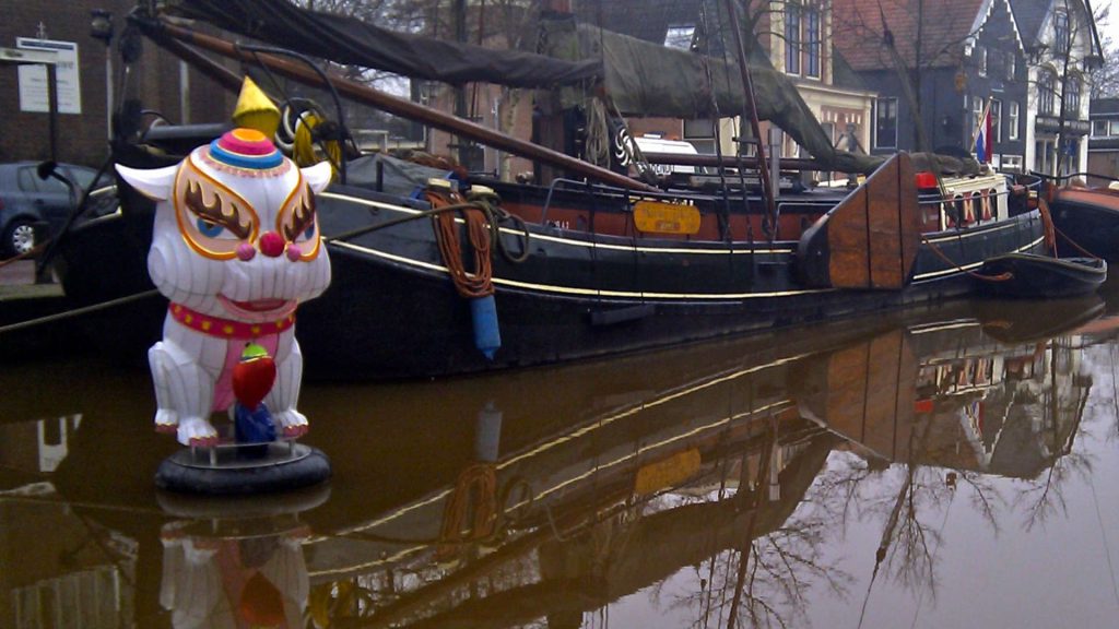 Op weg naar school viel mijn blik gisteren al op een blauw gedrocht in de gracht. Het katachtige wezen ligt ter hoogte van de dierenwinkel. Een stunt van de eigenaar, bedacht ik door de vies miezerige regen op weg naar het werk.