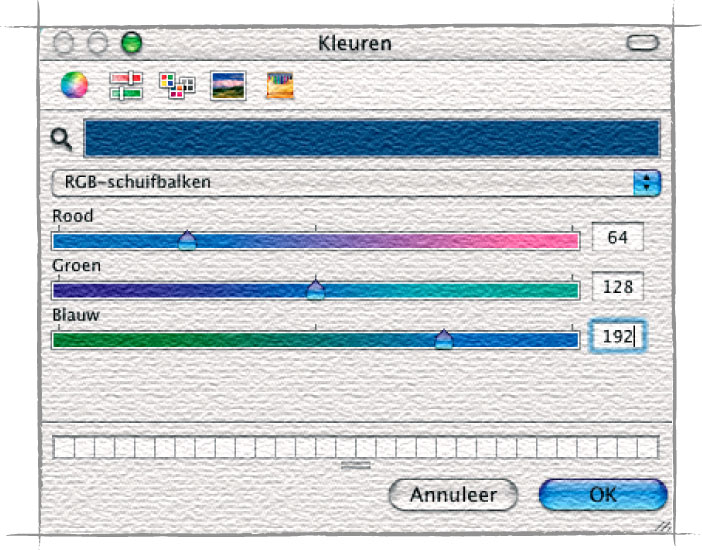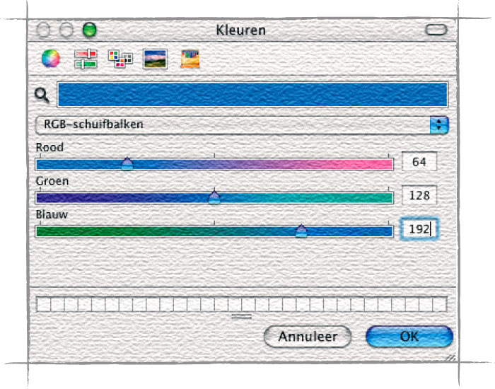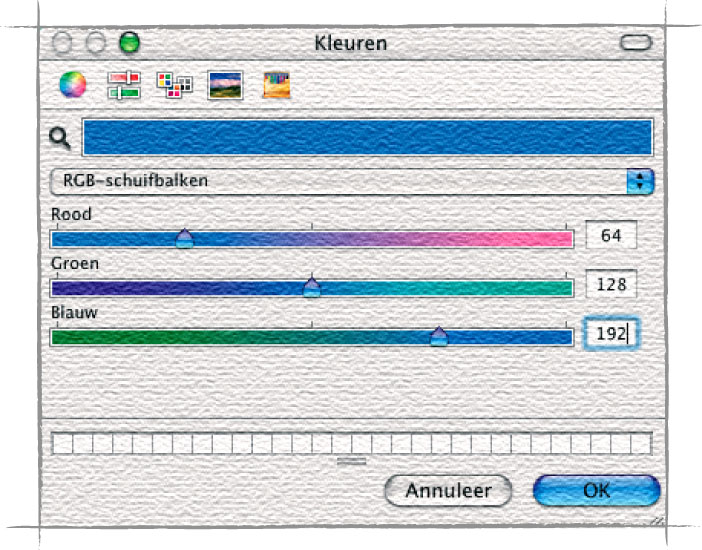 Een aardig idee van de manier waarop dit werkt is te zien door in Photoshop 7 (OS X) onder Voorkeuren | Algemeen | Kleurenkiezer de optie ‘Apple’ te selecteren, vervolgens op het vierkante symbool voor de voorgrondkleur onderaan het gereedschapspalet te klikken, bovenin het venster ‘Kleuren’ dat daarna verschijnt op het symbool met de schuifbalken te klikken en vervolgens de optie ‘RGB-schuifbalken’ te selecteren. Stel rood in op 64 (25%), groen op 128 (50%) en blauw op 192 (75%). Dit levert een fraai ‘zomerlucht blauw’ op.