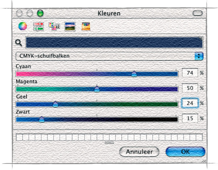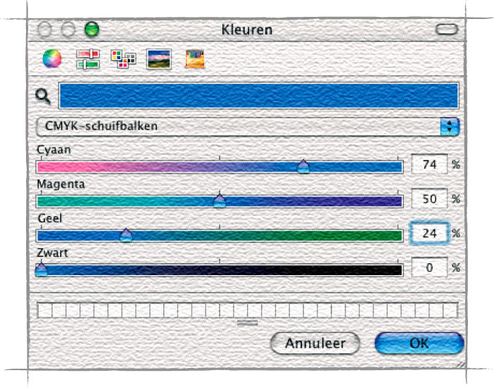 Kleuren laten zich ook omschrijven in percentages van de secundaire kleuren cyaan (C), magenta (M), geel (Y), aangevuld met zwart (K). Dit zijn de kleuren waarmee drukkers hun kleuren opbouwen. Wanneer u wederom in Photoshop op het vierkante symbool voor de kleur op de voorgrond drukt en in het venster ‘Kleuren’ nu ‘CMYK-schuifbalken’ selecteert, ziet u dat dezelfde kleur ‘zomerlucht blauw’ is opgebouwd uit 74% cyaan, 50% magenta, 24% geel en 0% zwart.