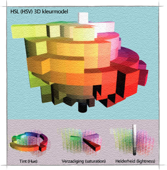 Apparaten hebben dus een echt universele kleurentaal nodig om goed te kunnen ‘praten’ met elkaar over kleur. De Commission Internationale de l’Eclairage (CIE) bedacht al in 1931 een methode om kleuren vast te leggen met behulp van numerieke waarden die waren gebaseerd op de manier waarop het menselijk oog reageert op kleuren. Aldus ontstond een driedimensionaal model, dat de individuele kleuren uit de kleurruimte beschreef met waarden op de X-, Y- en Z-as. Een voorbeeld van zo’n driedimensionaal model is HSV. Een kleur wordt in dit model omschreven door de tint (hue), de verzadiging (saturation) en de helderheid (value). De inkepingen in het model worden veroorzaakt door het feit dat het menselijk oog gevoeliger is voor sommige kleuren.