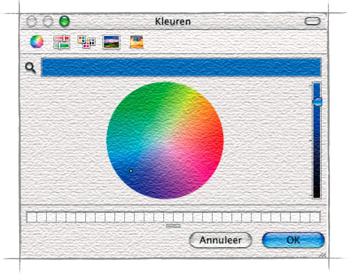 In de kleurenkiezer van Mac OS X is dit model ook een optie. Klik op het vierkante symbool in Photoshop voor de voorgrondkleur, vervolgens in het venster ‘Kleuren’ op de kleine gekleurde cirkel bovenin, en de kleurenkiezer geeft aan waar dit blauw zich in de HSV-cirkel bevindt en welke helderheid daar bij hoort. De helderheid kan worden aangepast met de verticale schuifregelaar rechts van de cirkel).