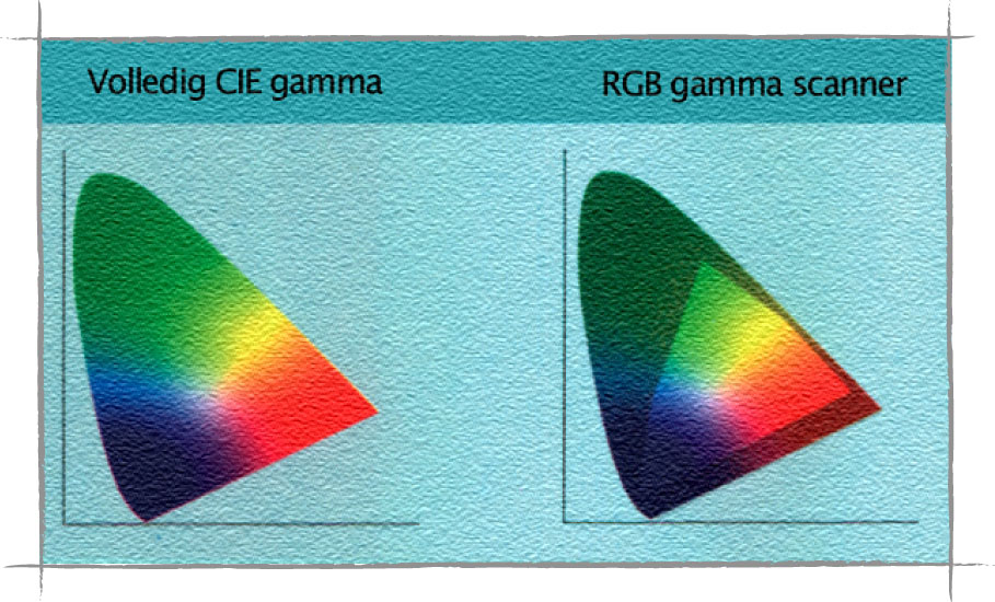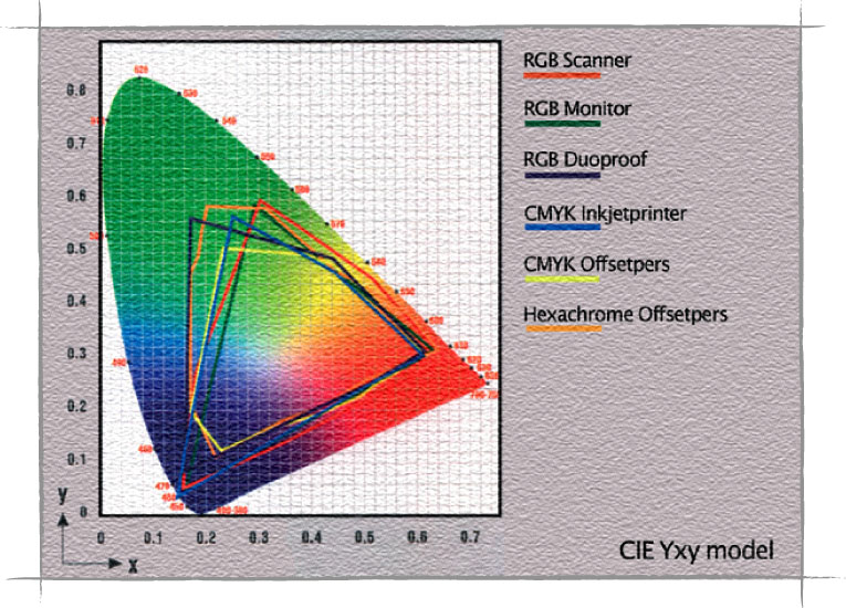 CIE-Lab is dus een kleurentaal die alle apparaten begrijpen. Nu moeten we nog weten hoe groot het kleurbereik (gamut) van een specifiek apparaat op een bepaald moment is. Met andere woorden, hoeveel verschillende kleuren het apparaat op een bepaald moment kan weergeven.