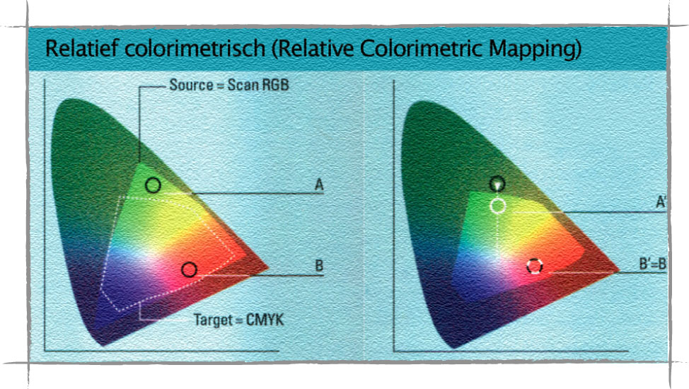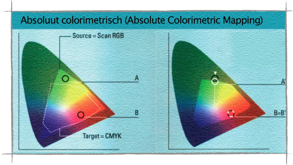 De absoluut colorimetrische methode verplaatst kleuren die niet in het doelgamut passen naar de rand van het uitvoergamut.