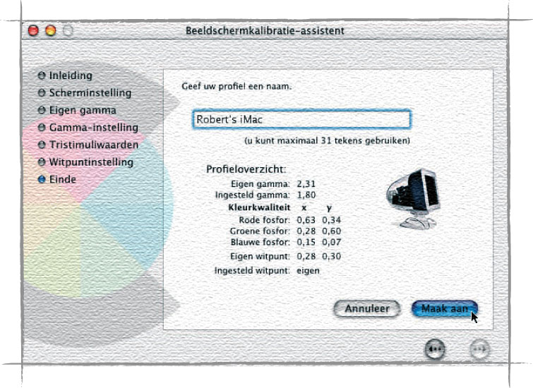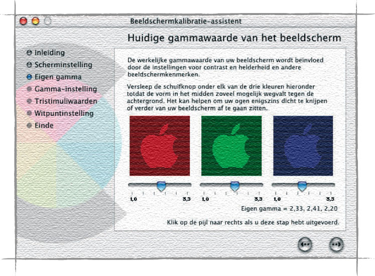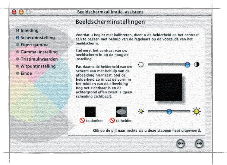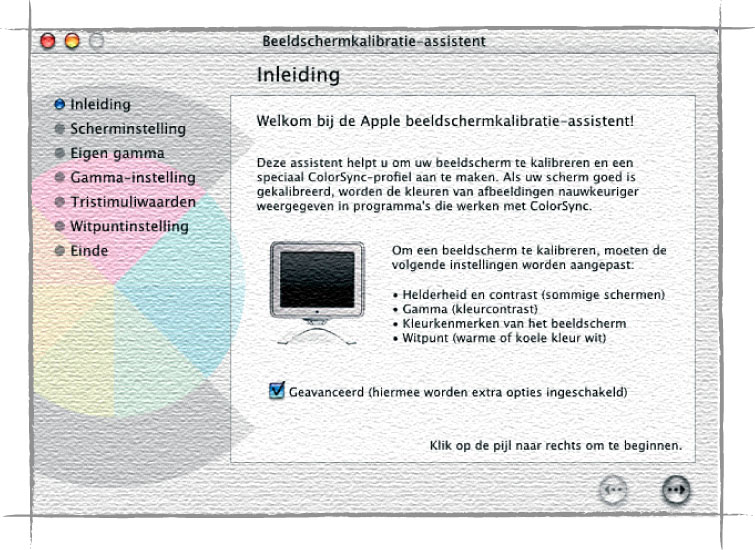De monitor is een heel belangrijk onderdeel van de hedendaagse DTP-workflow. Hier volgen de stappen die u moet nemen om onder Mac OS uw monitor softwarematig te kalibreren en er een profiel van te maken. Het kan ook hardwarematig, waarbij een apparaat de taak van uw oog overneemt. Deze methode is een meer betrouwbaar, maar ook veel duurder, omdat de apparaten waarmee dit kan worden gedaan erg veel geld kosten. Goed, over tot de menselijke methode: de ‘Monitor Calibration Assistant’ (Mac OS 9.x) en ‘Display Calibrator’ (Mac OS X) start u op via respectievelijk het regelpaneel ‘Monitoren’ en de systeemvoorkeur ‘Beeldschermen’. Selecteer in de lange lijst die Apple in het venster presenteert uw algemene monitortype en druk op ‘Kalibreer’. Vink in het openingsscherm de optie ‘Geavanceerd’ in, want hiermee krijgt u meer controle over de instellingen.