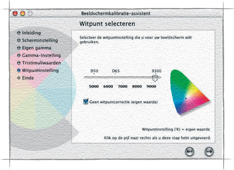 Een goed witpunt in het volgende venster is 6500 graden Kelvin. Dit is weliswaar een behoorlijk gelig beeld, maar omdat deze waarde in combinatie met het gamut van 1,8 het dichtst in de buurt komt van gedrukt materiaal is dit toch een goede waarde.