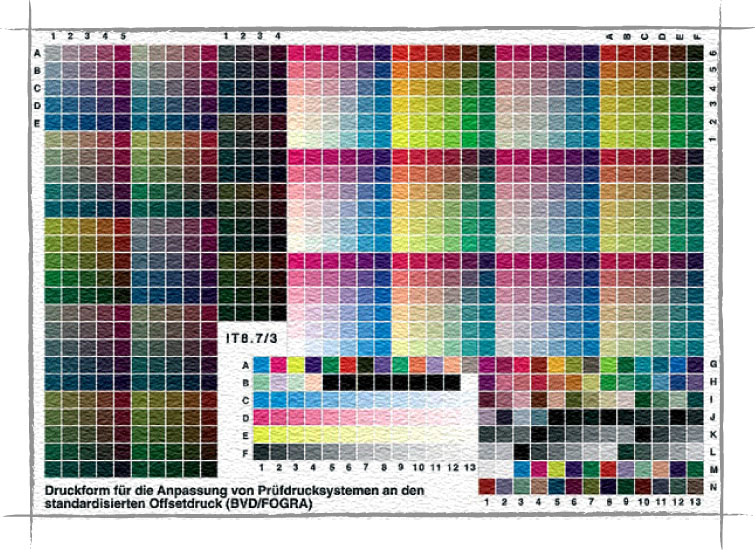 Er zitten secties voor de densiteiten, verzadigde kleuren zonder zwart, verzadigde kleuren met 20% zwart en de schaduwpartijen; en vlakjes voor 100% CMYK; vlakjes die de puntverbreding controleren; en neutraal grijze vlakjes die de grijsbalans checken. Kortom, een doorsnee wat hetgeen de pers of printer aan keuren kan drukken of afdrukken. Ook hier worden daarna alle vlakjes van het gedrukte of geprinte target opgemeten, vergelijkt software de meetwaarden met de referentiewaarden en stelt op basis hiervan een ICC-profiel samen.