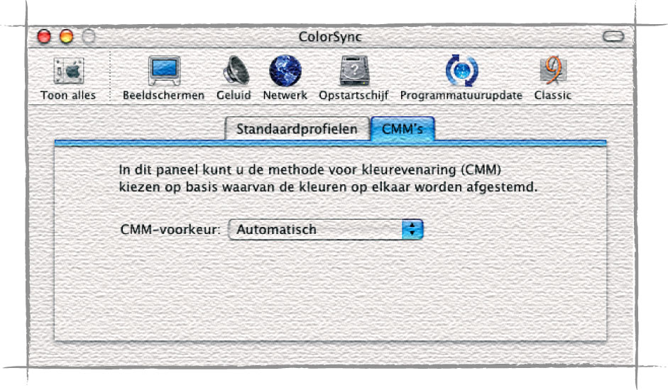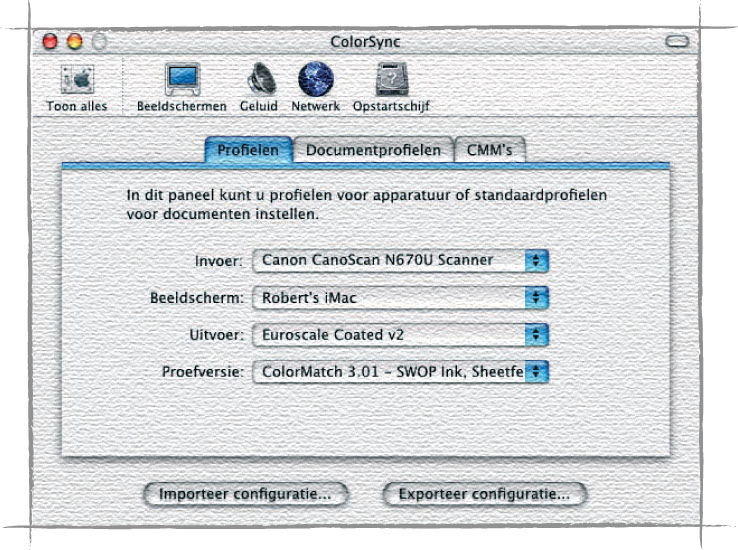 Er zijn nu profielen gemaakt van beeldscherm en drukpers of printer, maar op zich hebt u daar niet veel aan. De informatie over beeldscherm en drukpers in de profielen en de manier waarop de kleuren van de ene kleurruimte in de andere moeten worden omgezet (gamut mapping), moet met elkaar worden uitgewisseld. Het wordt daarom tijd om de profielen aan elkaar te koppelen met ColorSync, de ‘Haarlemmer olie’ van het color management vanuit Mac OS X.