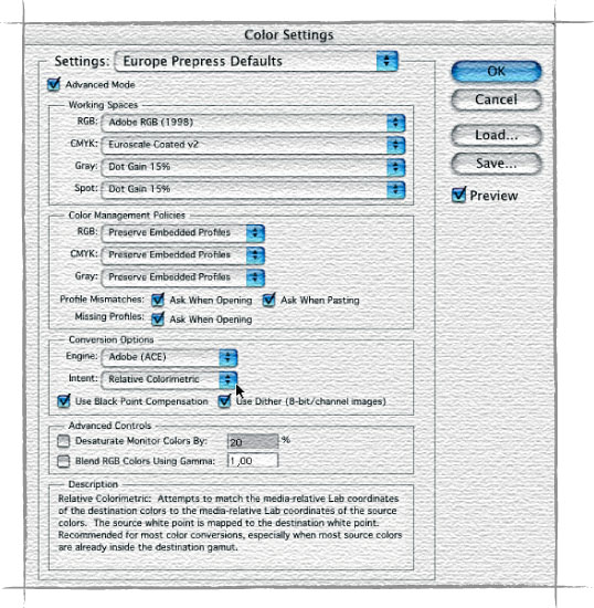 Na het instellen van color management op systeemniveau, gaan we verder met de instellingen in de belangrijke grafische programma’s; te beginnen met Photoshop 7. Kies in dit programma in het menu ‘Photoshop’ voor de optie ‘Color Settings’. U zet in het venster de optie ‘Geavanceerde modus’ aan en kiest uit de lijst daarboven voor de optie ‘Standaard instellingen drukwerk voorbereiding Europa’.