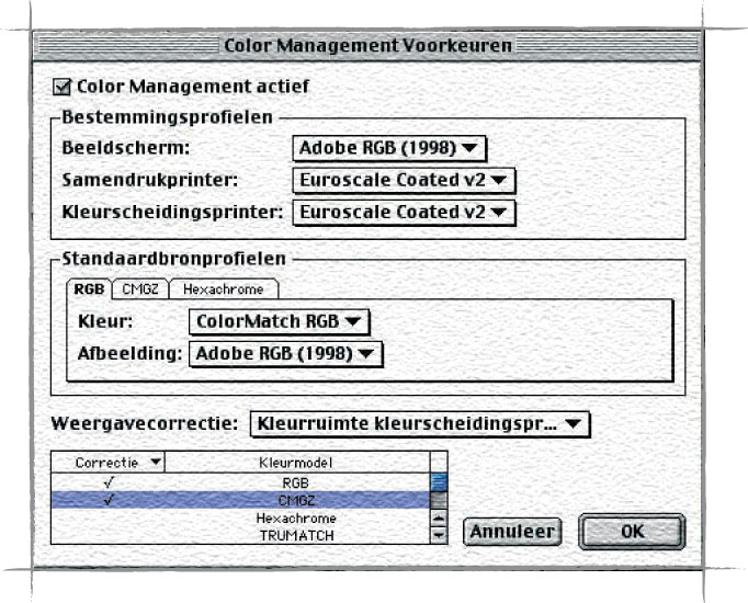 Start ColorSync op en selecteer het tabblad ‘Profielen’. Selecteer bij ‘Invoerapparaat’ een specifiek profiel voor het invoerapparaat als u hierover beschikt. Gebruik anders een algemeen profiel zoals Adobe RGB. Selecteer bij ‘Beeldscherm’ het profiel dat u zojuist hebt gemaakt van uw monitor, en anders een algemeen profiel dat het dichtst in de buurt komt van uw monitor, Apple 15” LCD bijvoorbeeld. Stel bij ‘Uitvoer’ ‘Euroscale Coated v2’ in, tenzij u een betrouwbaar profiel hebt van de pers, bijvoorbeeld het profiel op basis van het afdrukken en doormeten van het IT87/3 target. Hetzelfde geldt bij de optie ‘Proefversie’: gebruik hier alleen een specifiek printerprofiel als u hierover beschikt. Het tabblad ‘Documentprofielen’ laat u met rust. Hierin legt u vast wat ColorSync moet doen met documenten die geen profiel bevatten. Dit legt u later vast in Photoshop. Het tabblad ‘CMM’s’ staat standaard ingesteld op ‘Automatisch’. Laat dat zo.