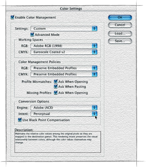 Photoshop geeft nu automatisch de instellingen weer die voor het merendeel der Europese grafische bedrijven voldoen. U mag bijna alles ongemoeid laten, behalve het doel (‘Intent’), waar de perceptuele methode (‘Perceptive’) moet worden gekozen, tenzij u werkt met huisstijlkleuren. Gebruik in dat geval de relatief colorimetrische methode (‘Relative Colorimetric’).