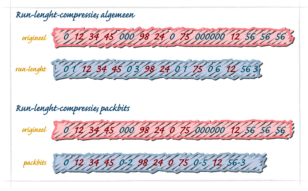 De verschillende strategieën bij datacompressie zijn het best uit te leggen aan de hand van twee relatief eenvoudige methoden. Bestanden bevatten bijna zonder uitzondering gedeelten waar een bepaald karakter zichzelf een aantal maal achtereen herhaalt. Denk hierbij aan een afbeelding van een strakblauwe hemel, of de vele spaties in witregels van tekstbestanden. Het is in zo’n geval handiger om te omschrijven dat een serie identieke karakters begint en hoeveel daarvan er achter elkaar staan, dan om al die karakters één voor één te beschrijven. Dit is precies de strategie die runlength volgt om bestanden te comprimeren. Een serie van acht nullen bijvoorbeeld wordt gecomprimeerd door één nul weg te schrijven die wordt gevolgd door het cijfer acht. Deze compressietechniek beperkt zich niet tot nullen of één ander specifiek karakter, maar kan worden toegepast op alle karakters in een bestand. Zo comprimeert PackBits, een toepassing van de runlenght-techniek, de serie 21, 21, 21, 21, 21 door hiervoor 21, -4 te noteren, de serie 5,5,5 door 5, -2 te noteren, enzovoort. Wordt een getal dus gevolgd door een getal met een minteken ervoor, dan betekent dit een serie van dit cijfer, die bestaat uit het absolute getal van het tweede cijfer, plus één.
