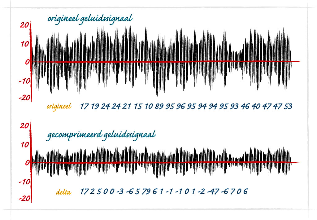 Deltacompressie is van een vergelijkbare eenvoud. Deze methode neemt slechts het eerste getal uit een reeks onveranderd over en noteert van alle daarop volgende getallen het verschil (de deltawaarde) met het voorgaande. Deze methode leidt alleen tot echt kleinere bestanden als de verschillen tussen de opeenvolgende getallen niet te groot zijn, zoals bij geluidssignalen veelal het geval is. Tekst en software laten zich daarentegen slecht comprimeren door deze methode. Een voordeel van deze methode is weer dat nieuwe reeksen van opeenvolgende nullen kunnen ontstaan wanneer het signaal over een bepaalde periode hetzelfde blijft. Het bestand kan dan nog verder worden gecomprimeerd door er runlength compressie op los te laten. Deze combinaties van technieken worden overigens wel vaker toegepast om bestanden te verkleinen. Zo wordt runlength in de eindfase toegepast in onder andere jpeg- en mp3-compressie.
