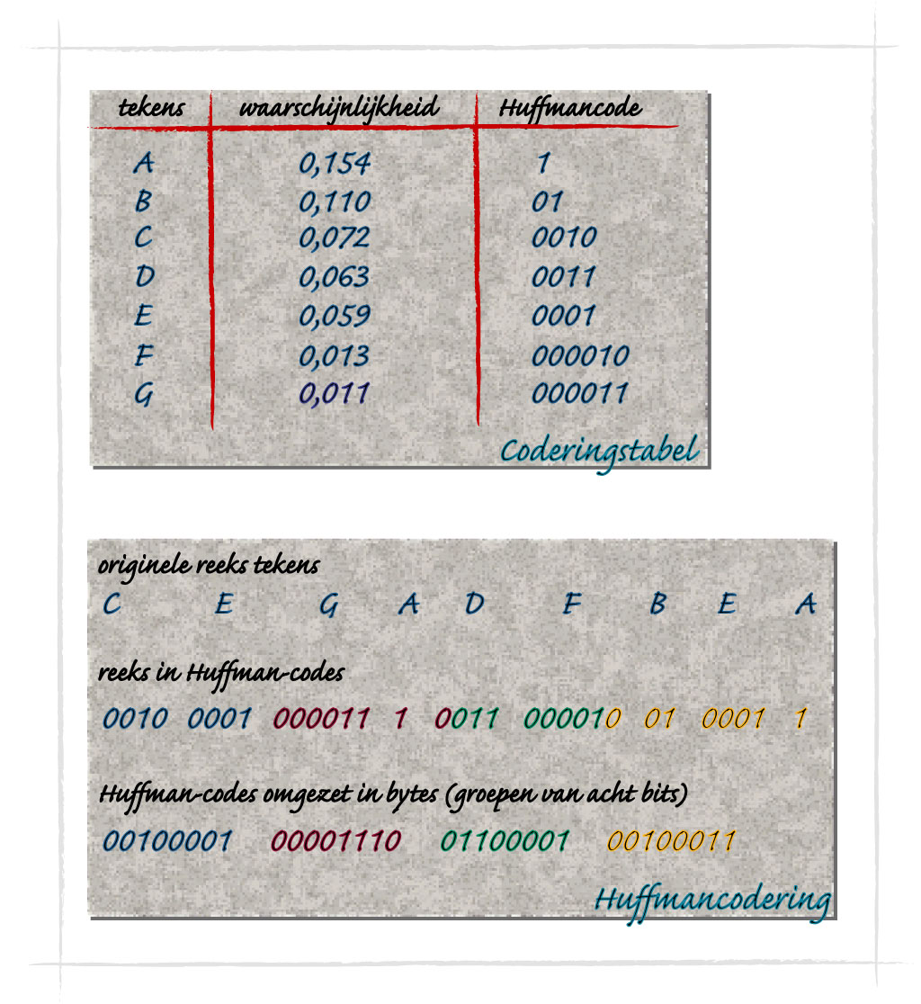 Een geheel andere strategie bedacht A.D. Huffman in de jaren vijftig. Hij maakte gebruik van het algemeen geldende principe dat in een bestand een klein gedeelte van alle mogelijke karakters het overgrote deel van het totaal aantal karakters vormt. Zo bestaat 96% van een tekstbestand uit slechts 31 van de 128 mogelijke karakters uit de ASCII-tabel die tekstverwerkers gebruiken. Dit zijn de onderkasten (kleine letters) uit het alfabet, de komma, spatie en punt en de return. In de computer worden alle 128 karakters uit de ASCII-tabel weergegeven door één byte, die weer uit acht bits bestaat. Eén bit informatie bestaat uit twee toestanden: 0 (uit) of 1 (aan). Acht bit aan informatie bestaat uit 2 tot de macht 8 is 256 mogelijke toestanden. Dit is dus meer informatie, maar het kost ook meer ruimte om het op te slaan. Huffman kreeg daarom het idee om karakters die veel voorkomen uit minder bits te laten bestaan en de zeldzamere karakters uit meer bits. Immers, als 96% van een bestand uit minder bits bestaat dan normaal, móet het wel kleiner zijn dan het origineel, redeneerde hij.