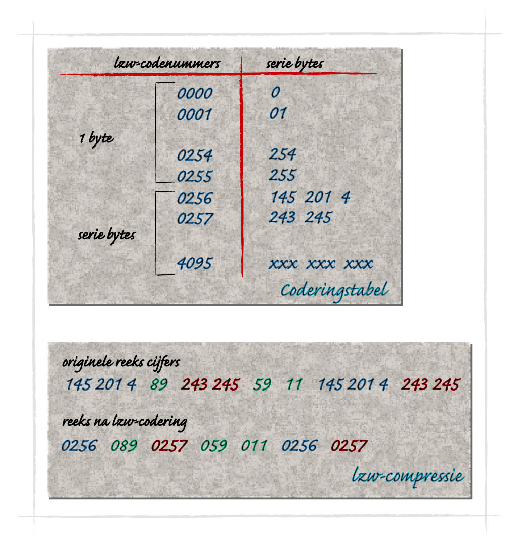 Deze compressiemethode ontleent zijn naam aan A. Lempel en J. Ziv, die de originele techniek ontwikkelden, en T. Welch, die later enkele verfijningen aanbracht. Het is een veelgebruikte methode om tekst, programmeercode, signalen, afbeeldingen en vergelijkbare bestanden te comprimeren. LZW maakt, net als de Huffman-compressie, gebruik van een tabel om data te comprimeren en weer uit te pakken. LZW gebruikt een tabel met 4096 codenummers, waarvan de eerste 256 enkele bytes representeren en de rest een serie bytes. Het codenummer 0000 staat dus voor de byte 0, 0001 voor de byte 1, 0255 voor de waarde 255, en 0256 voor bijvoorbeeld de serie bytes 145, 201 en 4, enzovoort. De inhoud van de tabel is variabel en krijgt pas gestalte op het moment dat de compressie plaatsvindt. LZW bekijkt het bestand en begint de tabel te vullen met series van bytes die het daarin tegenkomt.
