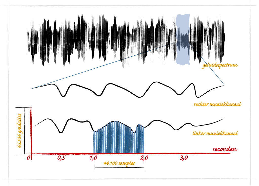 De analoge wereld is dus feitelijk bijna oneindig subtiel, maar de digitale wereld is dat om praktische redenen (opslagcapaciteit) niet. Het analoge signaal wordt daarom bij het omzetten (‘samplen’) niet exact gekopieerd, maar zo goed mogelijk benaderd. Het samplen van een analoog signaal komt erop neer dat een aantal maal per seconde wordt gekeken hoe hoog de golf is (de ‘sampling rate’) en wordt de waarde daarvan vastgelegd met een bepaald aantal gradaties (de ‘sampling precision’). Dit is de nauwkeurigheid waarmee de hoogte van de golf wordt vastgesteld, de afronding eigenlijk. Hoe nauwkeurig ook, het resultaat van samplen blijft altijd een benadering van het origineel.