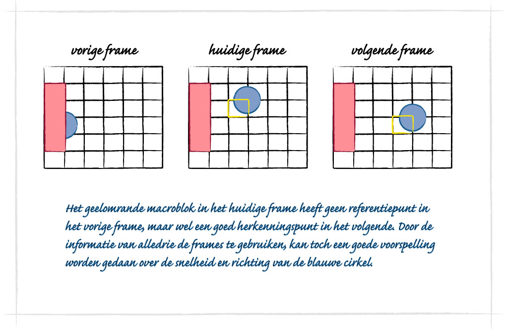 De meeste films zijn helaas een stuk dynamischer dan de voorgaande scène. Zelfs tijdens het journaal maakt een nieuwslezer af en toe plotselinge, heftige bewegingen, of maakt de camera een zwenkbeweging. Dan zijn de veranderingen van frame tot frame dus behoorlijk groot. Dan kan het gebeuren dat een bepaald object dat zich in een frame bevindt, in het daaraan voorafgaande frame nog helemaal niet te zien was, of zich op een extreem andere plek bevond. De voorspellende methode van de voorgaande paragraaf voldoet dan niet meer. Voor dat soort gevallen maakt mpeg gebruik van een voorspelling op basis van een voorafgaand frame én een volgend frame, een soort tweerichtingsverkeer dus. De techniek is verder hetzelfde: de frames worden ingedeeld in macroblocks van 16 bij 16 pixels en de snelheid en richting van de objecten daarin worden voorspeld. Frames die volgens deze methode zijn gecomprimeerd, heten ‘bidirectionally-predictive-coded’ of ‘B-Frame’